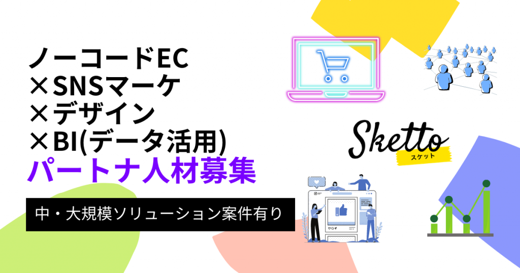 当社(株式会社プレスマン)では、2020年より、複数のノーコードを活用した掛け算人材集団(法人AM/ マーケッター/ ディレクター/ クリエイティブデザイナー)を形成しており、「ノーコードEC × SNSマーケ × デザイン × BI(データ分析)」を活用した、クライアントのEC / D2Cを推進する「中・大規模企業向けソリューション」(Sketto : スケット)を展開しています。